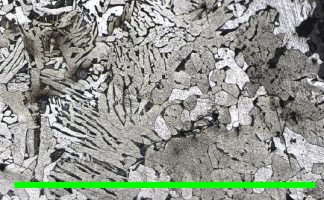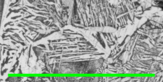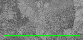An examination of the surfaces of the two samples in visible light after etching with nital reveals the microstructure of the iron. The green bar indicates 1mm. The H001 sample shows many different structures, suggesting many different regimes of iron formation. |