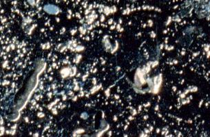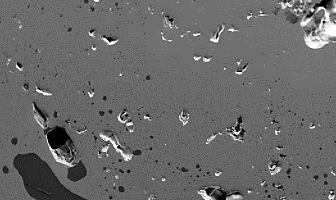 In both cases, a section was cut, mounted, and polished for analysis. The samples show iron with inclusions of other material, typically slag. Our H001 sample (right) was highly porous, with numerous voids. The H002 sample had fewer voids and inclusions. |